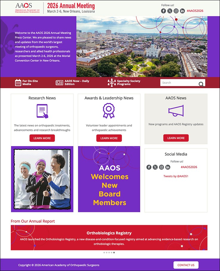The American Academy of Orthopaedic Surgeons is pleased to share news and updates from the world's largest meeting of orthopaedic surgeons, researchers, and allied health professionals as presented at the AAOS 2026 Annual Meeting in New Orleans, March 2-6, 2026.