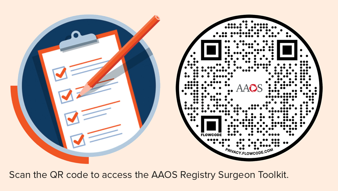 More detailed information about this process can be found online at aaos.org/registries/surgeon-toolkit. If you are interested in becoming a Registry Surgeon Champion, scan the accompanying QR code below to access the AAOS Registry Surgeon Toolkit.