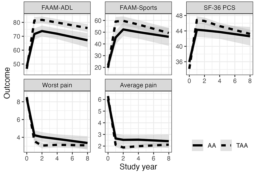 The study included 522 patients (419 TAA and 103 AA). Follow-up scores were available in 426 (82%) at four years, 346 (67%) at six years, and 269 (52%) at eight years. Analysis of eight-year data revealed that both groups maintained strong improvement in all outcomes compared with pre-