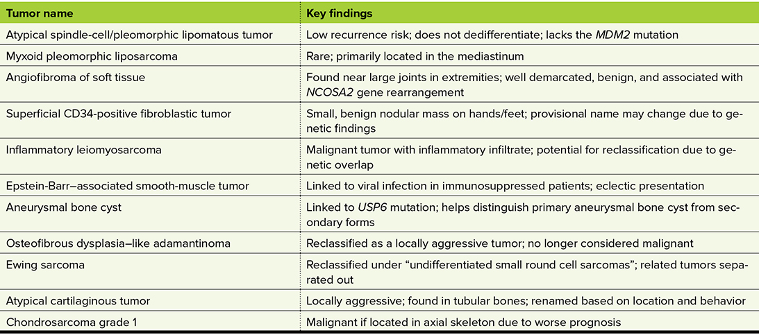 The latest edition of the “World Health Organization Classification of Tumors: Soft Tissue and Bone Tumors,” published in 2020, introduced several newly recognized soft-tissue and bone tumors (Table 1). Among them is the atypical spindle-cell/pleomorphic lipomatous tumor, a lesion composed of diverse cell types (hence the name “pleomorphic”), which has a low recurrence risk. Unlike the more common atypical lipomatous tumor, this entity does not dedifferentiate into malignancy or harbor the MDM2 mutation.