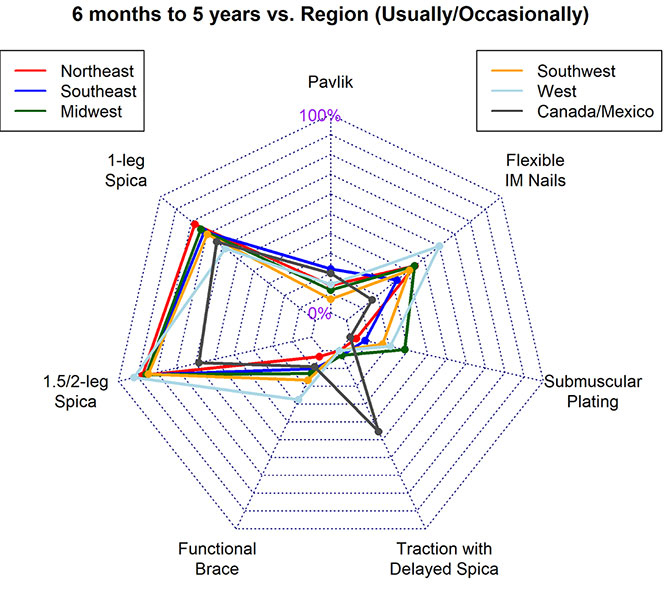 For patients aged 6 months to 5 years, spica casting was the most common treatment, with 175 respondents reporting that option. Surgeons aged 60 years or older were more likely to use flexible intramedullary nails (FINs) in this age range, and surgeons from Canada or Mexico were more likely to choose traction with delayed spica. Submuscular plating was more commonly reported by surgeons in the Midwest, West, and Southwest. Figure 1 shows geographical variations in treatment type used in this patient age range.
