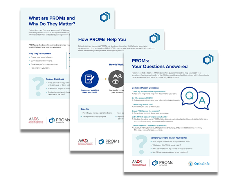 The AAOS Committee on Healthcare Safety, which will soon formally integrate the PROMs Workgroup, has developed patient-facing educational resources to increase PROMs awareness and understanding. These resources are designed to support meaningful conversations between patients and their care teams about how PROMs contribute to high-quality, patient-centered orthopaedic care. These materials include a fact sheet that explains what PROMs are, why they matter, and what patients should know before completing them; a set of frequently asked questions and a conversation guide outlining key questions patients may ask their clinician about completing PROMs and interpreting their results; and an infographic that visually walks patients through the process and benefits of participating in PROM data measurement. The information is hosted on OrthoInfo’s new PROMs-dedicated page.