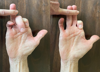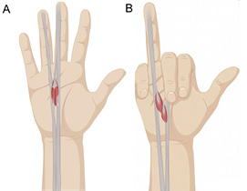 Another common type of injury is lumbrical injury (Figure 2), which most commonly results from single-finger crimp gripping, particularly involving the long or ring finger. Diagnosis is supported by a positive lumbrical stress test (Figure 3), in which pain is felt during the extension of the affected finger while the adjacent fingers are held in flexion; of note, the pain is not felt when two fingers are extended simultaneously. Management is typically nonoperative, with recovery often taking approximately five to six months.