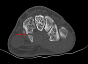 Acute traumatic injuries can occur from falls (e.g., falling on an outstretched hand), sudden slips while gripping holds, or violent dynamic moves. Falls or impacts can lead to fractures or dislocations. For example, a sudden slip from a Sloper grip (Figure 1B) can result in hamate hook fracture, thumb medial collateral ligament (MCL) injury, or finger pulley injury. Unlike injury in contact sports, in which a hamate fracture may be due to a direct blow, hook of hamate fractures are reported among climbers using undercling holds or other forceful grip techniques. Injury presents as ulnar-sided palm pain and can be missed on standard radiographs (Figure 4). Nondisplaced fractures heal with immobilization, but persistent symptoms or displacement often warrant surgical treatment of the fracture. Surgical excision may result in finger flexion weakness and should be avoided in this population when possible. Triangular fibrocartilage complex (TFCC) tears are an additional cause of ulnar-sided pain; they are seen with an increased incidence in climbers and may be confirmed through MRI imaging. Another common type of acute trauma injury occurs as a collateral ligament injury to the thumb metacarpophalangeal (MP) joint or long finger PIP joint. Surgical indications for long finger PIP collateral ligament injuries are not well defined.