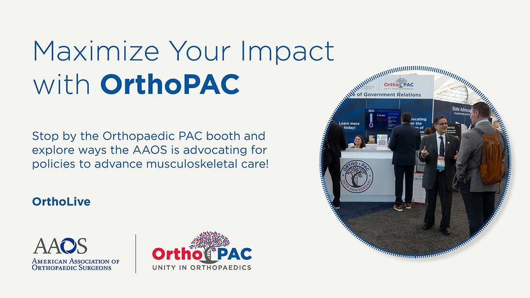 Take the first step in becoming an orthopaedics advocate by visiting the booth for the Political Action Committee of the American Association of Orthopaedic Surgeons (OrthoPAC) in OrthoLive. AAOS Office of Government Relations (OGR) healthcare policy experts and advocacy leaders will be at the booth to discuss today's top legislative and regulatory issues as well as ways to easily stand up on behalf of the orthopaedic profession. Conveniently located in OrthoLive, the booth will be open Monday through Thursday from 7 a.m. to 5 p.m.