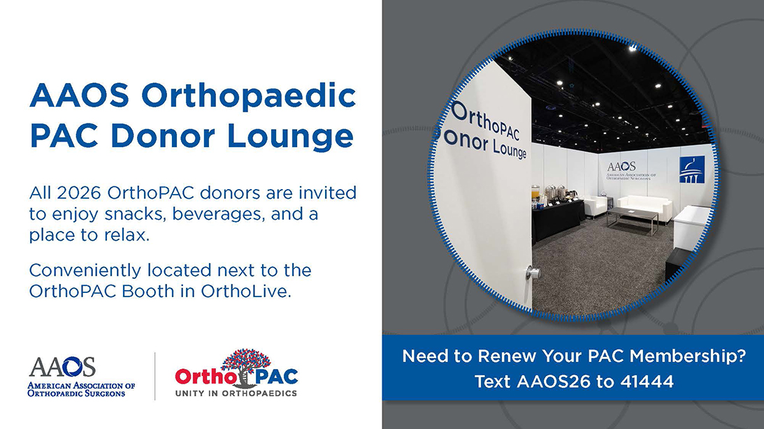 OrthoPAC members of all contribution levels are also invited to visit the booth's OrthoPAC Donor Lounge to grab a snack, refresh, and relax during the busy week. Learn more about renewing your OrthoPAC membership and the PAC's exciting plans for 2026. Existing 2026 donors and new donors are always welcome.