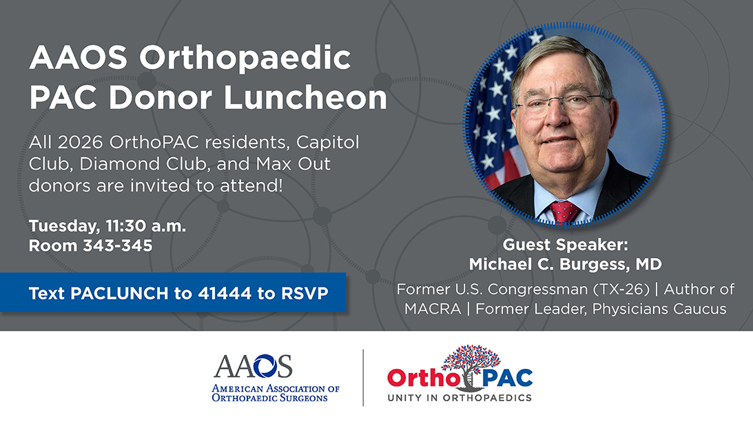 How can orthopaedic surgeons ensure they have a seat at the table when it comes to health policy? All 2026 OrthoPAC Resident, Capitol Club, Diamond Club, and Max-Out donors are invited to attend the annual donor appreciation luncheon, Tuesday from 11:30 a.m. to 1:30 p.m. in room 344, for insights from physician and former congressman Michael Burgess, MD, who served as a prominent voice on healthcare issues in the House of Representatives.