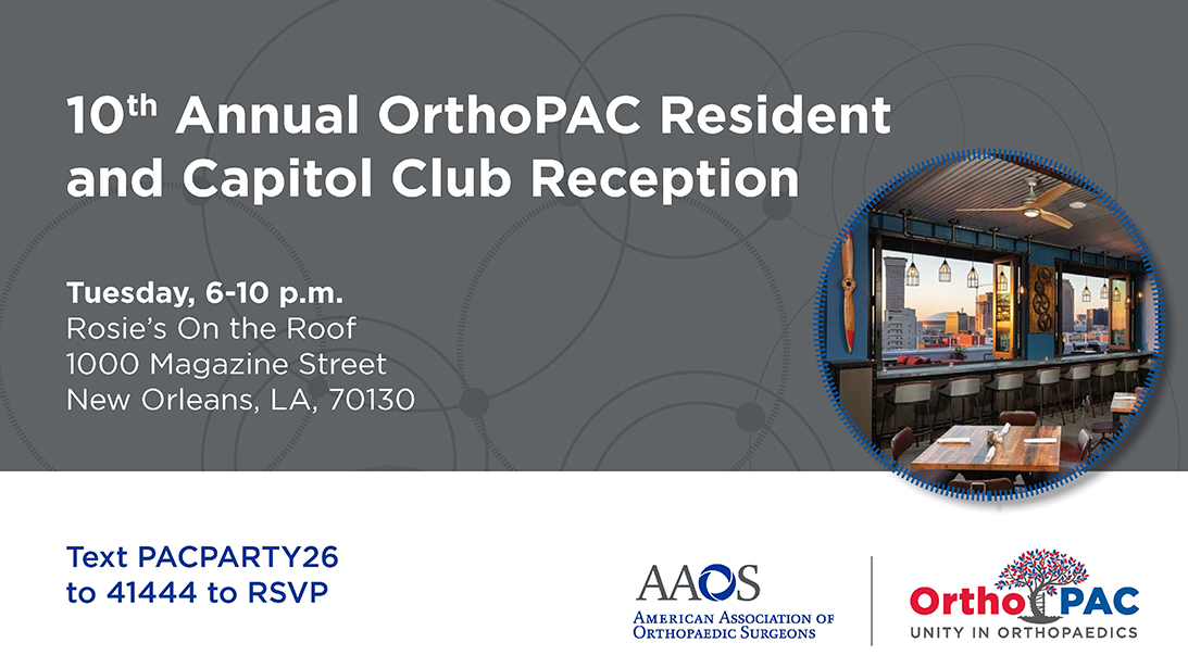 All 2026 Resident contributors and Capitol Club members are invited to attend the 10th annual Resident and Capitol Club Reception. Hosted by the AAOS Orthopaedic PAC and AAOS leadership, this is a great event for residents to network with AAOS leaders and for current and veteran advocacy leaders to engage with residents. Members of the Board of Councilors, Board of Specialty Societies, and AAOS leadership at the OrthoPAC Capitol Club level will also be in attendance.