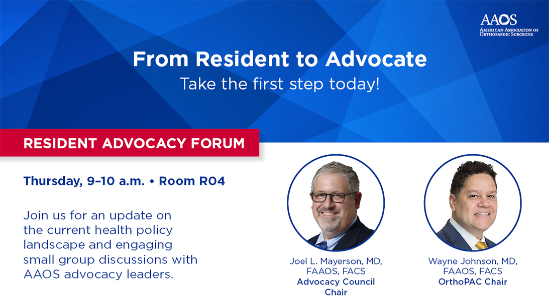 This year, AAOS will also host a Resident Assembly Advocacy Forum. All resident attendees are invited to learn more from AAOS Advocacy Council Chair, Joel Mayerson, MD, FAAOS, FAOA, and OrthoPAC Executive Committee Chair, Wayne Johnson, MD, FAAOS, FACS. The advocacy update will be followed by small group discussions with AAOS advocacy leaders. The forum will take place on Thursday from 9 to 10 a.m. in room R04.