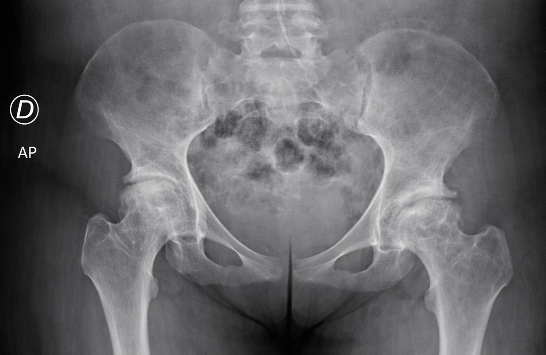 Osteonecrosis of the femoral head (Figure 1) is one of the most common and debilitating orthopedic complications of SCD. It is estimated that nearly 50% of affected patients will experience avascular necrosis of a major joint during their lifetime, and a significant proportion will ultimately require total hip arthroplasty (THA). These patients often present with a distinctive phenotype, characterized by a slender body habitus, low muscle mass, elongated limbs, and an overall asthenic appearance. From a metabolic and skeletal standpoint, chronic hemolytic anemia, marrow hyperplasia, and reduced bone mineral density are frequently encountered.