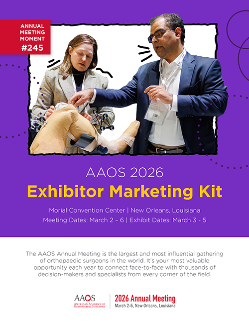 Download the Exhibitor Marketing Kit for expert tips and practical tools to help you stand out at the AAOS Annual Meeting. Whether you're a first-time exhibitor or a seasoned pro, this guide is packed with insights to help you make a bigger impact - before, during, and after the event.