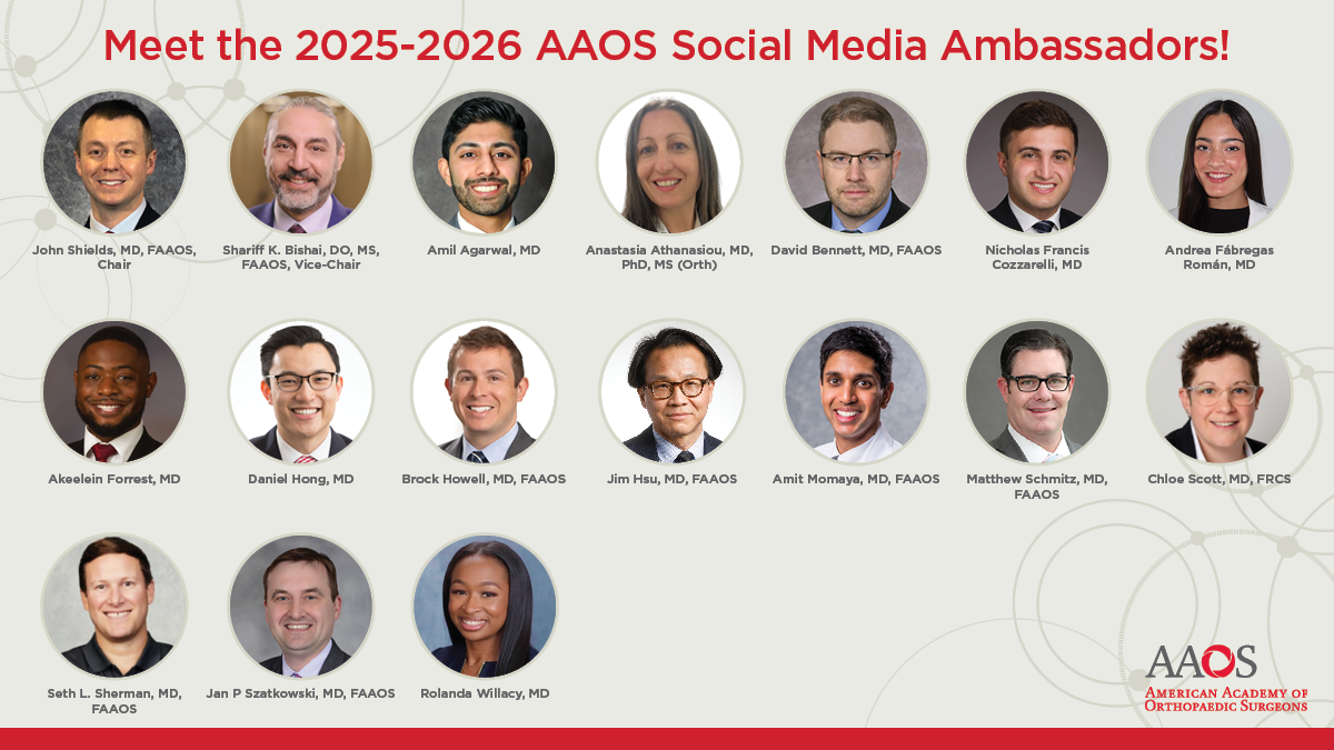 The AAOS Social Media Ambassador Program is comprised of AAOS members who are very active on social media and maintain an established, public presence on either Twitter, Instagram, LinkedIn and/or Facebook. These members serve as AAOS brand ambassadors who help shape AAOS social media campaigns and promote AAOS programs, initiatives, news, and information to their followers on social media.