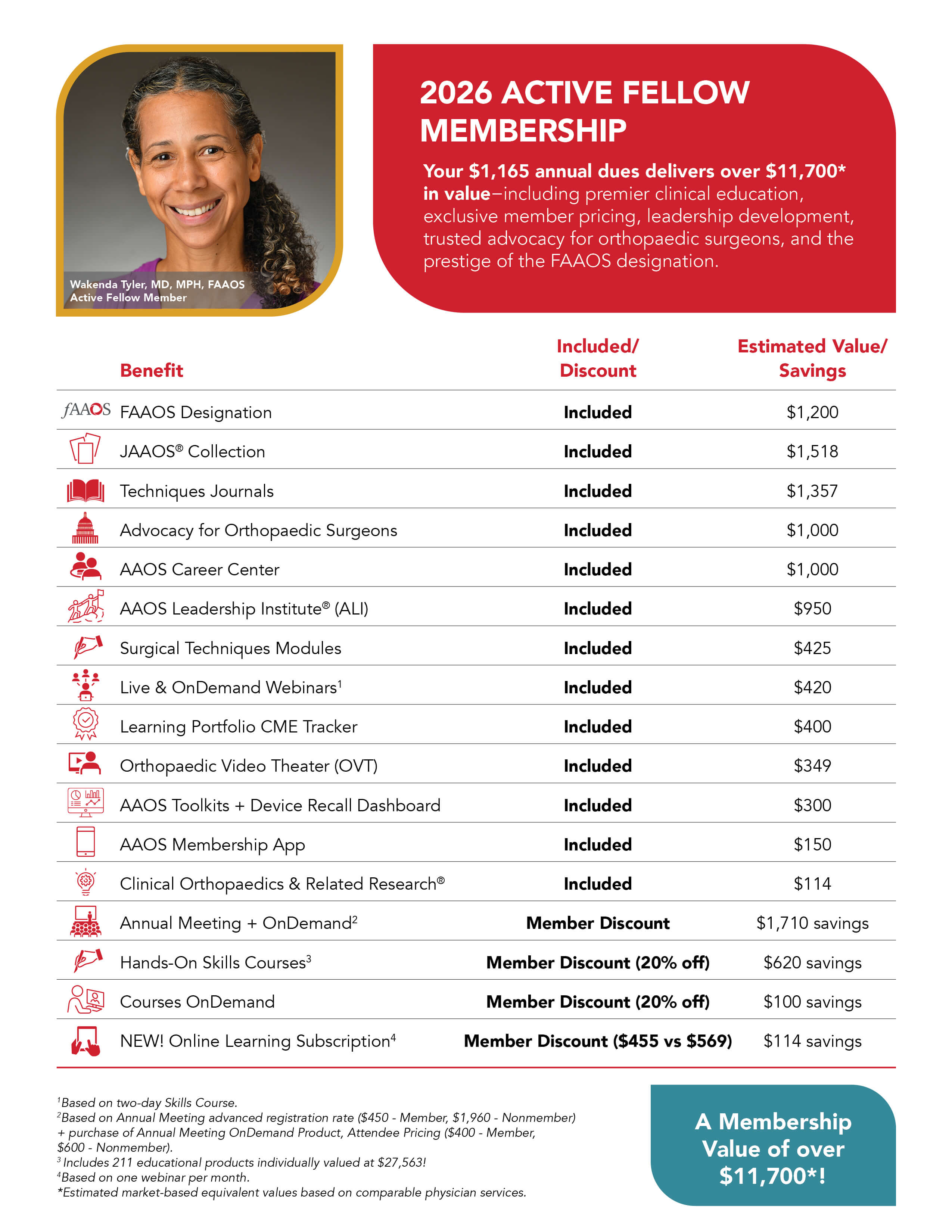 Active Fellow Membership dues for 2026 are $1,165, with a special early-bird member rate of $350 for Annual Meeting registration. For a total of $1,515, you’ll unlock access to over $11,700 in exclusive benefits—all designed to advance your career and keep you at the forefront of orthopaedic excellence. Explore the benefits below to see what awaits!