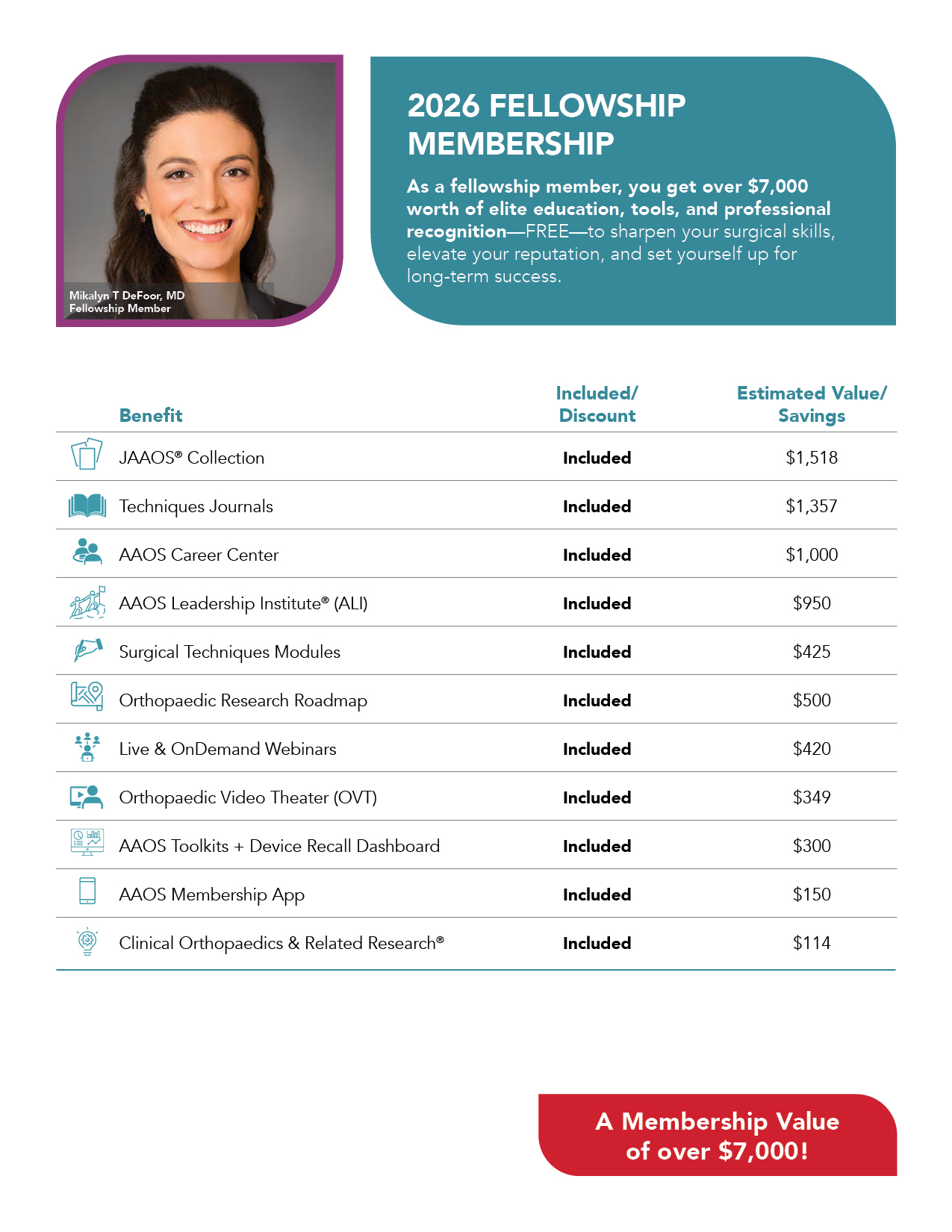 Fellowship Membership is complimentary while you participate in a postgraduate orthopaedic fellowship program. Fellowship Members can access all the benefits shown below plus more for a total 2026 Membership value of more than $7,000.