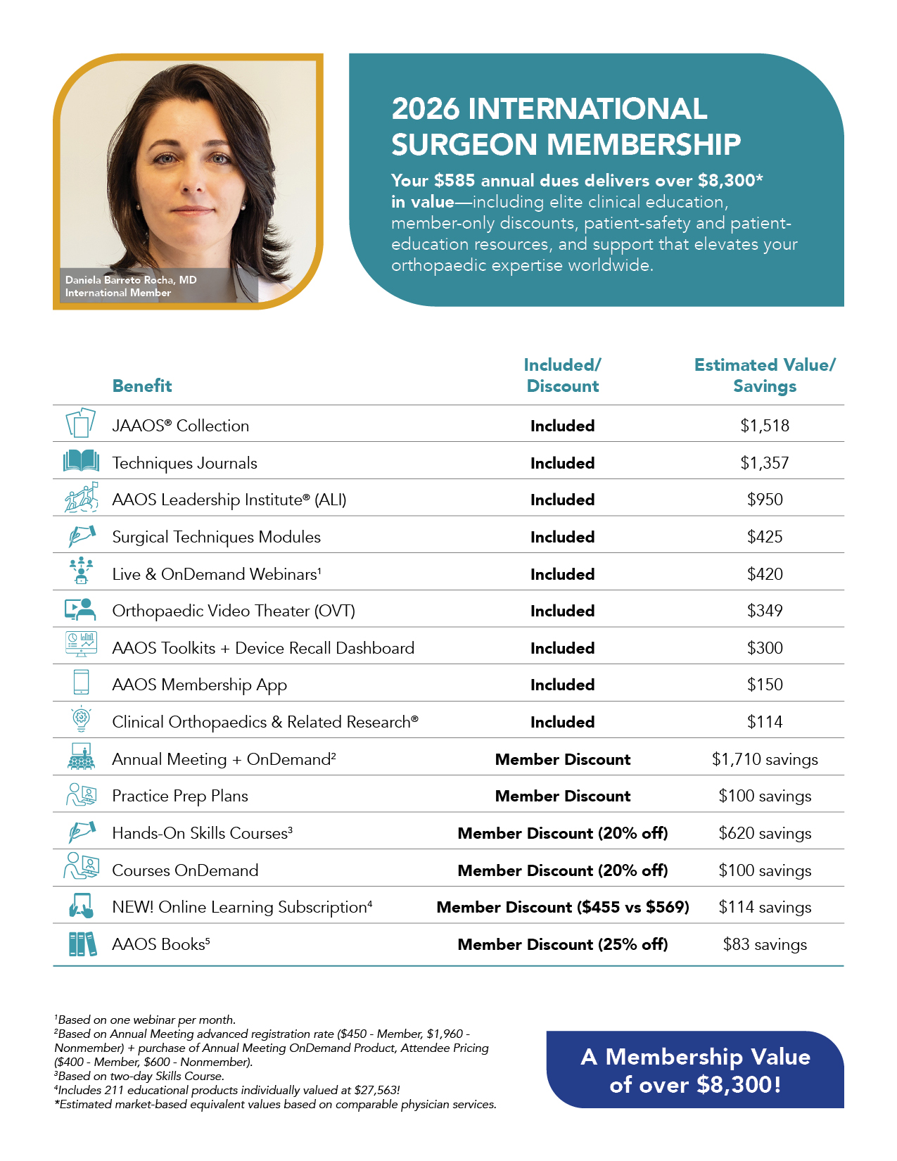 International Orthopaedic Surgeon Membership dues for 2026 are $585, with a special, early-bird Annual Meeting registration member rate of $350*. For a total of $935, you’ll unlock access to over $8,300 in exclusive benefits—each one tailored to advance your career and keep you at the forefront of orthopaedic excellence. Explore what’s included below!