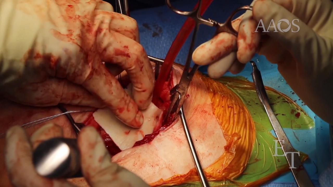 This video demonstrates open gluteus medius reconstruction via a double-row technique with acellular dermal allograft. The procedure is performed via a 6- to 8-cm incision centered over the greater trochanter followed by longitudinal splitting of the iliotibial band and the deep fascia. Tendon mobilization is performed to increase tendon excursion. Decortication at the footprint helps create a bleeding cancellous surface. We used two suture anchors in the lateral facet and the superoposterior facet near the medial border of the footprint. The sutures were passed through the tendon and graft and secured to the bone distal and lateral to the medial row anchors. This double-row repair allows for a broad area of graft compression to the osseous bed, which increases structural strength of the repair and healing.