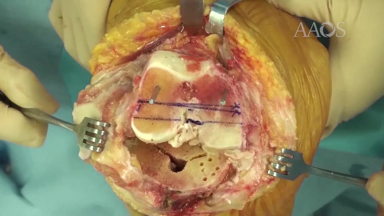 1. The incision is started 3 cm above the patella, and the knee joint is exposed via an anteromedial approach.
